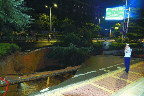 参与救援的林山寨巡防队员郭峰事发时就在现场,据他介绍,塌陷是从快车道开始的,“当时就塌了一小块儿,水哗哗地往里灌。”这时,天已经不下雨了,一些经过的市民停下观望塌坑,“有人还拿出手机拍照”。