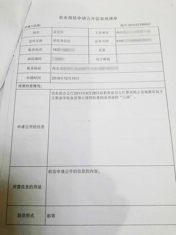 原告孟某告诉澎湃新闻,此次诉讼主要是针对农业部以涉密为由拒绝公开其在2011年9月28发给教育部办公厅的一份公函。孟某称,这份公函中,农业部要求教育部“纠正”各地教育部门下文禁止学校食堂给孩子吃转基因食用油的“错误”。