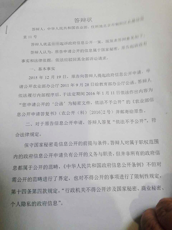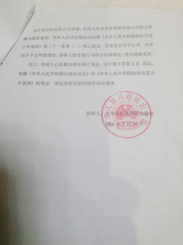 农业部则在提交给法庭的答辩状中指出,农业部已经根据《中华人民共和国政府信息公开条例》相关规定,在法定期限内答复原告不予公开,并告知不予公开的理由,“答复行为符合法律规定”。