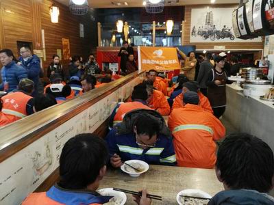 (图为环卫工人,交协警等人员在就餐)