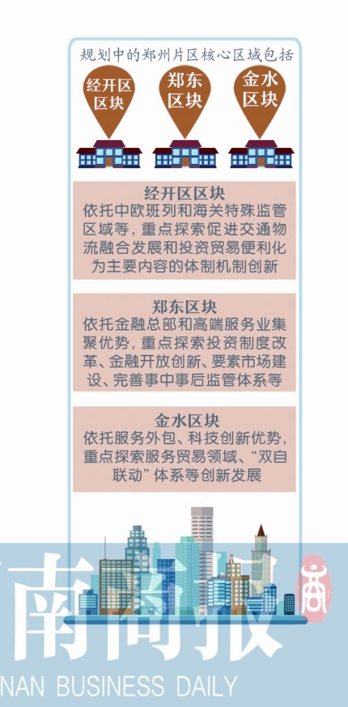 按照规划,河南自贸区郑州片区核心区域包括经开区区块、郑东区块和金水区块。