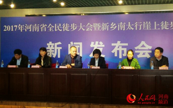 人民网郑州4月6日电 4月6日上午,2017年河南省全民徒步大会暨新乡南太行崖上徒步文化年新闻发布会在郑州举行。据了解,2017河南省全民徒步大会将于4月22日在新乡南太行八里沟景区举行。届时,来自全国各地的3000余名徒步运动爱好者,将充分体验徒步南太行的精彩与刺激。