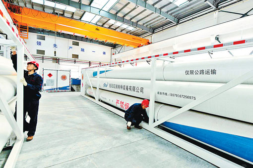 4月6日,在洛阳725所双瑞特装公司,工作人员正在对即将下线交付的产品进行严格检验。该公司所生产的直径660毫米大容积无缝气瓶,具有完全自主知识产权。潘炳郁 摄