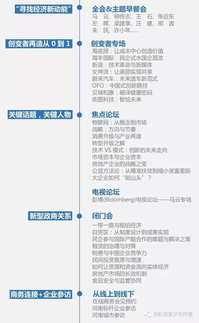 明后两天,在38场高密度、大容量的活动中,千余名与会者将共同探讨中国商业如何实现可持续发展。这38场活动,有焦点论坛、创业者论坛,还有恳谈会和全会。焦点论坛主要邀请最有代表性的人物关注那些最核心的话题,创业者论坛由近年来最瞩目的明星创业者分享其经历,恳谈会将由政府部门领导和企业家们共同探讨新型的政商关系等。