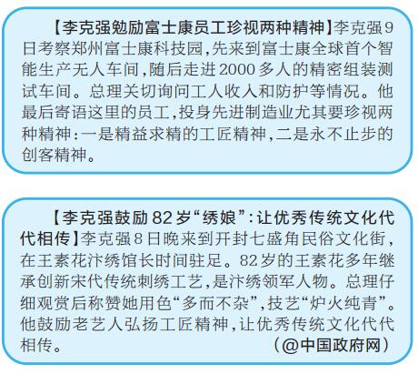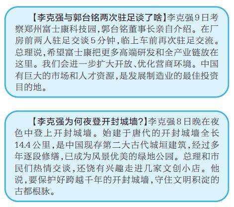 在郑州富士康科技园,李克强考察了企业智能生产线、组装车间,并与创客团队交流。企业介绍说他们通过大众创业、万众创新激发了员工智慧,年轻人在努力创造中拥有更好发展机会。李克强对专程赶来的企业负责人郭台铭说,中国仍是外商投资的热土,我们的产业工人具有既勤劳又智慧的强大优势,希望更多外商不仅将生产基地,而且将研发中心等设在这里,抓住中国产业结构升级带来的新机遇,促进产业集群发展并带动更多就业,实现共赢发展。