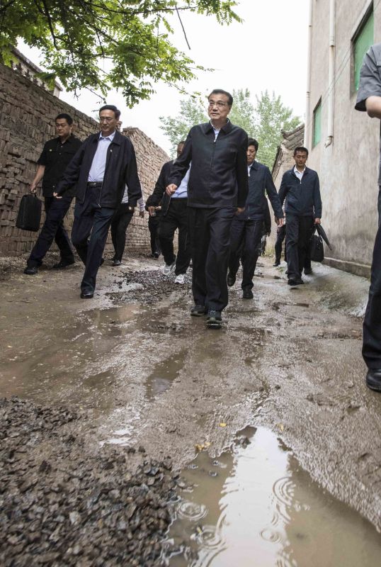窗外一直下着雨。会前,李克强结束开封考察后,专程驱车一小时赴新乡市封丘县黄河滩区,冒雨踩着泥泞小路实地察看黄河滩区,并入户探望滩区居民。
