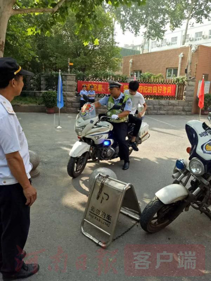 8时42分,郑州26中考点门口,考生小张从考场内急急忙忙地跑出来,来到正在执勤的郑州交警一大队二中队指导员王璐面前。