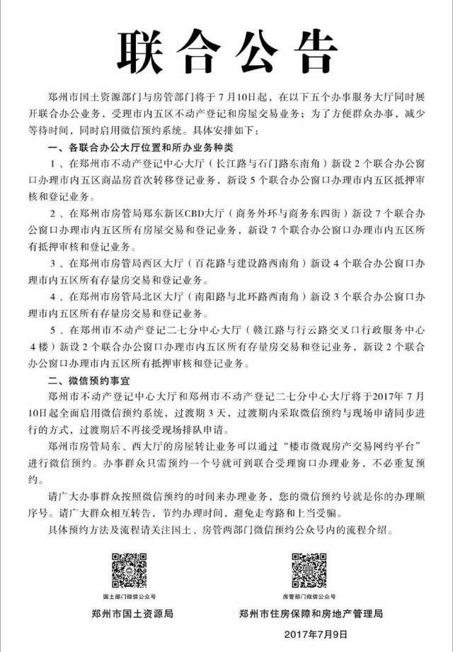 7月9日,记者从权威渠道获得消息,郑州市国土资源部门与房管部门将于7月10日起,在郑州市区五个办事服务大厅同时开展联合办公业务,受理市内五区不动产登记和房屋交易业务。