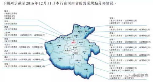 网点全面开花。2016年11月,中原银行洛阳分行开业,中原银行市级布局在河南18市实现全覆盖。数据显示,截至2016年12月末,中原银行业务网络包括一个总行营业部、17家分行、421家支行(包括305家城区支行、116家县域支行),共439个营业网点,覆盖18个省辖市及82个县,达到省辖市全覆盖和接近80%县城覆盖。