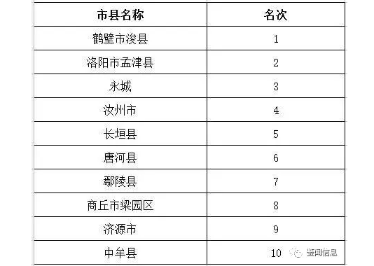 《公示》名单显示,鹤壁浚县、洛阳孟津县、永城市、汝州市、长垣县、南阳唐河县分别排第1至第6位。