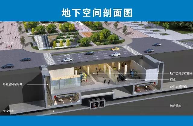 地下三层综合环廊工程地下空间规划的以综合管廊、公共交通环廊和商业设施为主,该工程使整个中央文化区地面真正形成“无车区”,区域内人车分流,届时,机动车全部通过地下交通系统运行。同时地面规划则是绿轴广场,东西长2公里,南北宽60米。建筑群以这条绿轴为界分布,这里将会形成一条纵向的“城市绿轴”画卷。