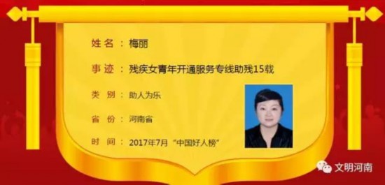 25年前的一场车祸让她重度残疾,挣扎着从死亡线上走过来的梅丽,凭着顽强的意志,用自己的能力和爱心帮助最需要帮助的人。从2002年开始,以她名字命名的全省首家助残服务专线——“梅丽热线”正式开通,15年来,累计接听服务热线电话3万余次,协调安置残疾人就业200余人,帮助提供法律维权援助近百起,为残疾人婚姻成功牵线搭桥46对。