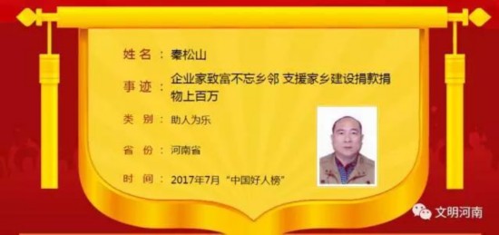 他创业致富不忘乡邻,帮助数百名乡亲就业创收,仅在他的公司里,就有20多人成为骨干,10多人成为独立的创业者;他支援家乡建设,先后捐款捐物上百万元,资助困难乡亲和贫困学生。个人先后荣获“豫籍优秀外出务工、创业人员”、“河南省建筑安全先进个人”等称号。