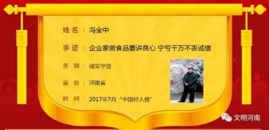 20年来,他坚持用道德良心做放心食品,严格抵制“增白剂”“增筋剂”,坚决不用硫磺熏麦面,冯氏面业食品合格率年年达100%;“非典”导致公司停业,他却坚持给工人发工资;别人邮错款,他二话没说全数返还......因为坚守诚信,20年来,他亏损近千万元。