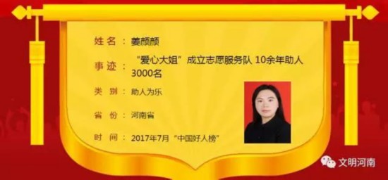 姜颜颜,女,1984年6月出生,河南省周口市太康县城关回族镇人,“叶子帮办”志愿服务队发起人。