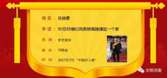6年来,她无微不至地照顾着脑瘫儿子和年老多病的公婆,用行动诠释了好媳妇的担当,用爱心、孝心、耐心感染着乡邻。2015年,吕晓素被评为长葛市道德模范,2016年,吕晓素被评为许昌市第三届孝老爱亲模范。