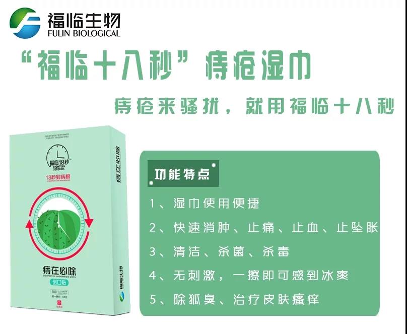 福临18秒主要是以湿巾的形式,每次只需擦拭患处并按敷18秒即可,内痔外痔均可适用,方便快捷,全面杀菌,无毒无刺激,并具有愈合功能。经过药液浸泡,药液提取自中草药,擦拭后快速感到清凉冰爽、亲肤、无毒无刺激。在擦拭完患处后可将湿巾折叠,用于擦拭患处周边区域,然后在折叠一次擦拭内裤,达到全面杀菌,防感染的目的。含黏膜修复因子,快速修复破损伤口及黏膜,并可预防再次破损,有效促进血液循环。还可适用于狐臭、皮肤瘙痒。