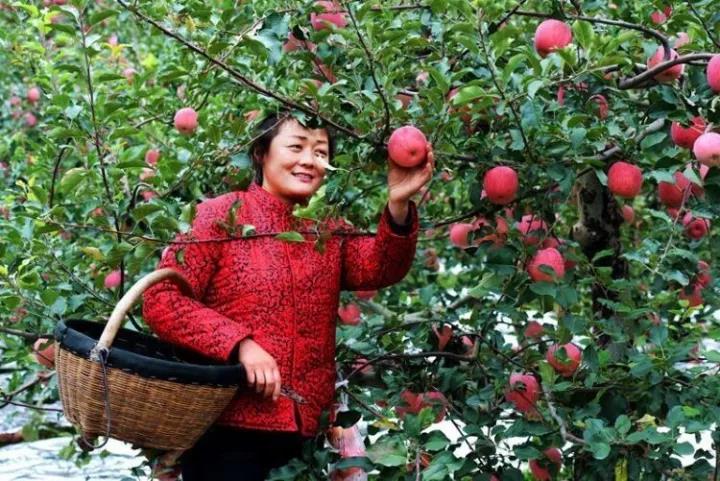 收获季节来临,站在果树下,伸手触摸果实的那一瞬间