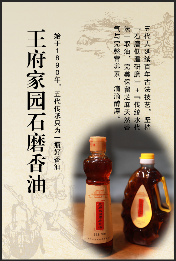 守得一盘石,磨得万家香,王府家园石磨香油从老王家的小作坊到现在成为初具规模的企业,历经了百年历史,在新时代的今天我们一样会坚持做油为次,做人为先的祖训,王府家园石磨香油传承的不仅仅是手艺,还有祖祖辈辈踏实做人,用心做事的规矩。